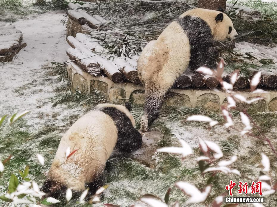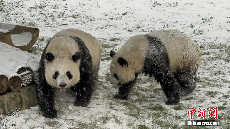 12月15日,西安迎來降雪天氣,在西安秦嶺野生動物園里,兩只憨態(tài)可掬的大熊貓來到戶外,在雪地里玩起了摔跤。時而互相追逐,時而摟抱在一起,玩得不亦樂乎。