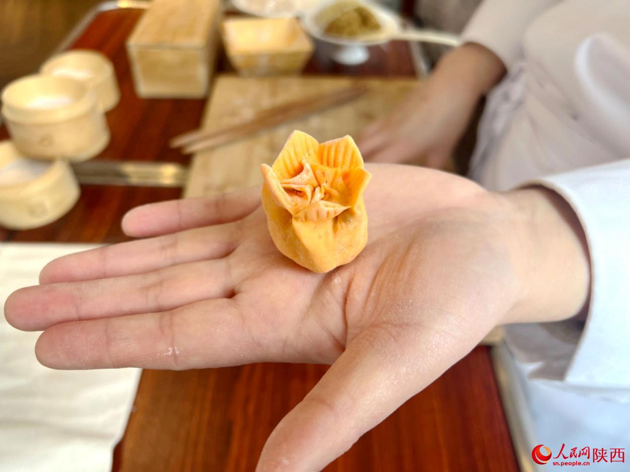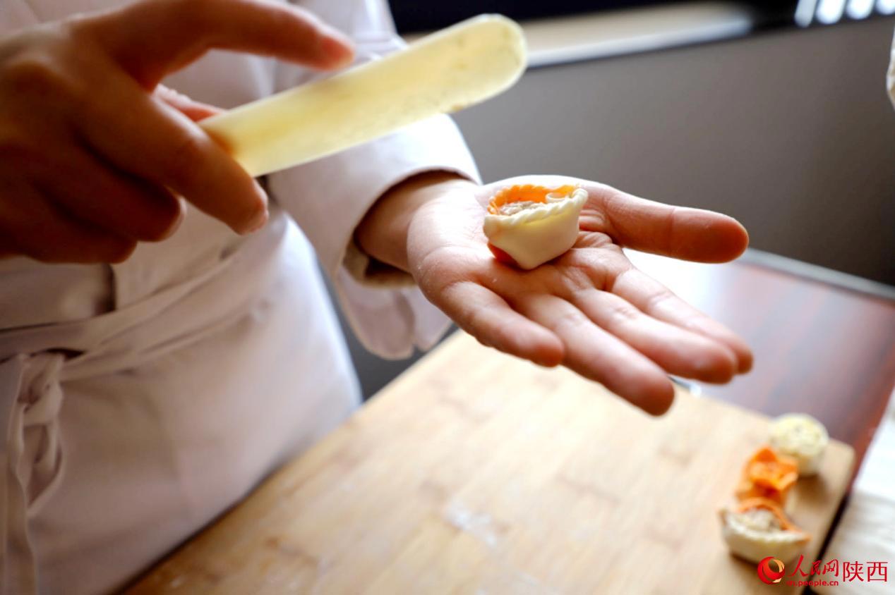 當(dāng)美食與文化結(jié)合,會碰撞出怎樣的火花?高珊手上動作不停,一朵“芙蓉”、一朵“石榴花”隨著她的手指翻飛逐漸變得栩栩如生?!啊鏊饺亍厦嬗?3個孔,代表著13個王朝曾在陜西建都,而‘百花迎賓’的形狀來源于西安市的市花——石榴花,表達(dá)的是對所有來賓的熱烈歡迎?!备呱航榻B道。