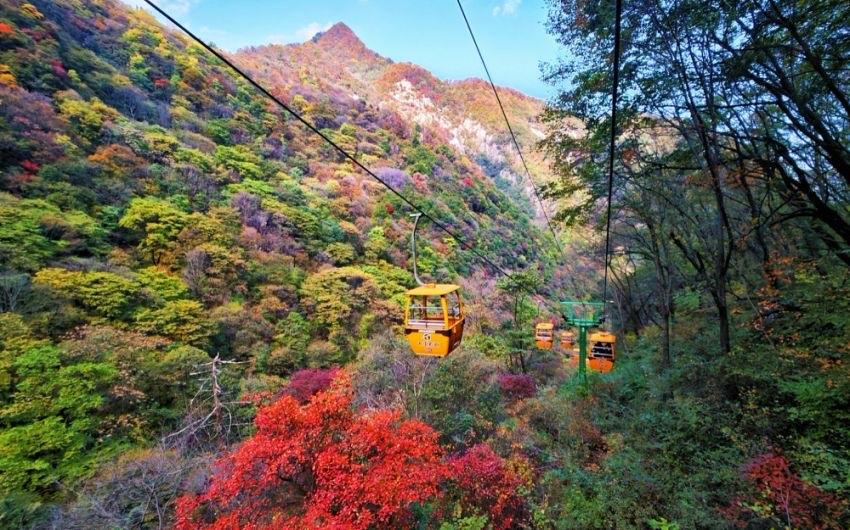 秋冬之交,園內的楓葉、黃櫨等樹葉逐漸變色,漫山遍野的紅葉如火焰般絢爛,似云霞般奪目,與翠綠的松柏、金黃的銀杏交織在一起,構成一幅幅絕美的畫卷。