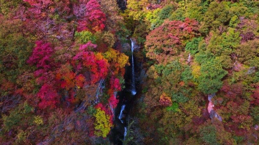 園內有眾多瀑布,如彩虹瀑布、仙鶴橋瀑布等,瀑布飛瀉而下,激起層層水霧,在紅葉的映襯下更顯靈動。從空中俯瞰,瀑布猶如銀針貫穿于萬木之中,與周圍的山巒、樹木共同構成了山水相依的自然景觀。